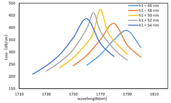 Covering the surface of the fiber with a metal film is necessary to achieve the SPR phenomenon. Figure 5 indicates the loss peak of the sensor for a gold film of thickness of 46 nm–50 nm. As shown in the figure, as the thickness increases, the loss spectrum exhibits a blue shift. As gradually changes from 54 nm to 50 nm, the resonance intensity increases due to the thinning of the gold film, reaching the highest loss value at . Therefore, 50 nm may be an optimum gold film thickness.
