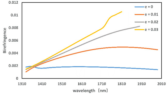 When the core region is doped with germanium, the core RI increases. However, the RI of the cladding remains unchanged, thus enhancing the optical confinement of the fiber and allowing the mode field to become more concentrated. Figure 6 shows that the birefringence is up to 1.06 × 10−2 at . It can be seen from the figure that the fiber with germanium-doped has a higher birefringence than ordinary fibers without germanium-doped, and the effect of birefringence is better with increasing germanium content within a certain range. At the same time, because the symmetry of the fiber structure is broken, a part of the mode field is distributed in the cladding when the incident wavelength is long. As a result, the birefringence effect becomes more pronounced as the wavelength increases.