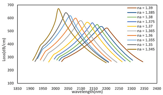 The sensing properties of the PCF sensor are discussed next. Figure 7 presents the loss peak of the sensor suggested in this paper for different analyte RIs. When increases, the resonance wavelength will appear as a redshift. When , an anti-crossing effect occurs, and the coupling phenomenon between modes varies from incomplete to complete coupling.