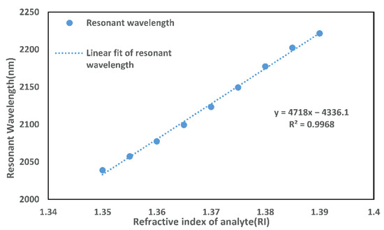 Figure 8 shows the linear relationship between resonance wavelength and RI for 1.345–1.39. The formula in the figure is the result of the linear fitting. The fitted line has . The larger the R-Square, the better the linear fit of the curve, which demonstrates that the sensor has a low non-linear error. The average wavelength sensitivity of this PCF-SPR sensor is 4718 nm/RIU when 1.35–1.39. When , it has the highest sensitivity of 5600 nm/RIU.