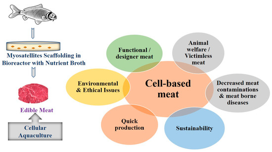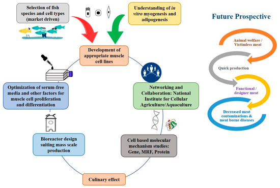 The combination of improved cell culture and tissue engineering has facilitated the production of meat outside the body of an animal [58]. With the objective of producing meat, which is physiologically and biologically similar to conventional farm meat, these muscle tissues are produced by culturing stem cells of an organism in the controlled environment of a bioreactor with appropriate media and nutrients to differentiate itself into the muscle cell and/or fat cells and proliferate to increase the mass of meat in the scaffold [36]. The schematic representation of networking and future prospective of cellular aquaculture is represented in Figure 2. For in vitro meat production, cells, such as embryonic stem cells, and adult stem cells (i.e., microsatellite cells) are used [36,59]. The selection of stem cell type differs based on the objective, i.e., for increased regenerative capacity, satellite cells are preferred over other cells, muscle cells are preferred for the production of protein-rich meat [60], and adipose tissue-derived adult stem cells are selected for its ability to produce myogenic, osteogenic, and adipogenic cell lineages [61].