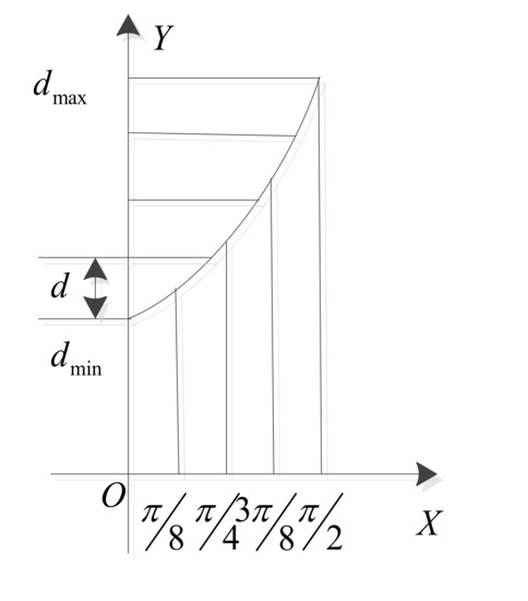 The corresponding relationship between the function curve and the layer thickness is shown in Figure 5. Firstly, the layer thickness is set on the closed interval , and then, according to the angle of β and Equation (9), the relational formula of the layer thickness can be expressed as follows: