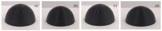Finished parts of hemispherical model. (a) Finished part with slicing thickness of 0.4 mm. (b) Finished part with slicing thickness of 0.3 mm. (c) Finished part with slicing thickness of 0.2 mm. (d) Finished part manufactured by adaptive layering based on optimal volume error.