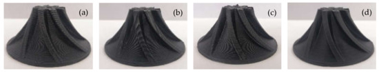 In the experiment, the algorithm presented in this paper is compared with the equal-thickness layered slices, which are 0.2 mm, 0.3 mm, and 0.4 mm. The slice thickness interval of the optimal volume error algorithm is set as [0.1, 0.5] mm. The G codes generated by the different algorithms are imported into the 3D printer control system to print the parts. The printed parts are shown in Figure 10; Figure 11, in which Figure 10a–c and Figure 11a–c display the equal thickness slicing Figure 10d and Figure 11d display the optimal volume error adaptive slicing. The layer thickness in Figure 10a and Figure 11a is 0.4 mm, the layer thickness in Figure 10b and Figure 11b is 0.3 mm, and the layer thickness in Figure 10c and Figure 11c is 0.2 mm; Figure 10d and Figure 11d display the finished parts printed by adaptive layering based on the optimal volume error.