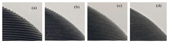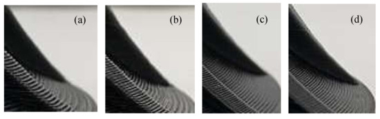 A partial enlargement of the printed hemispherical experimental part is shown in Figure 12, in which Figure 12a–c correspond to the partial enlarged views of the equal-thickness layering method in Figure 10a–c and Figure 12d corresponds to the partially enlarged views of the optimal volume error method in Figure 10d. A partial enlargement of the printed turbine blade experimental part is shown in Figure 13, in which Figure 13a–c correspond to the partial enlarged views of the equal-thickness layering method in Figure 11a–c and Figure 13d corresponds to the partially enlarged views of the optimal volume error method in Figure 11d.