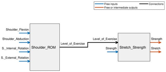 Rule evaluation is one of the most critical aspects of designing a functional fuzzy-logic-based system. The number of rules in the system is determined depending on the number of input parameters and their corresponding membership functions. While it is possible to create a FIS with a large number of inputs, this often leads to a very high number of rules, which may become difficult to keep track of; therefore, we have broken the system down into a fuzzy tree structure with two FIS blocks as shown in Figure 1. The first system determines the level of ROM exercises the patient can be assigned. This is determined using the different ROMs of the shoulder. The second system determines the intensity of stretching and strengthening exercises the patient will be capable of carrying out. The output of the first system is fed into the second system as one of the inputs (indicated by the black arrow in the figure). The strength input and output both have the same membership functions, however, the output strength is applied depending on both the input strength as well as the patient’s shoulder ROM indicated by the “Level_of_Exercise” output from the shoulder ROM fuzzy system. This is discussed further in Section 3.2.2.