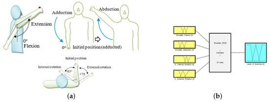 Shoulder ROM FIS and its respective motions: (a) Schematic of shoulder joint motions; (b) the FIS for determining the level of exercise.