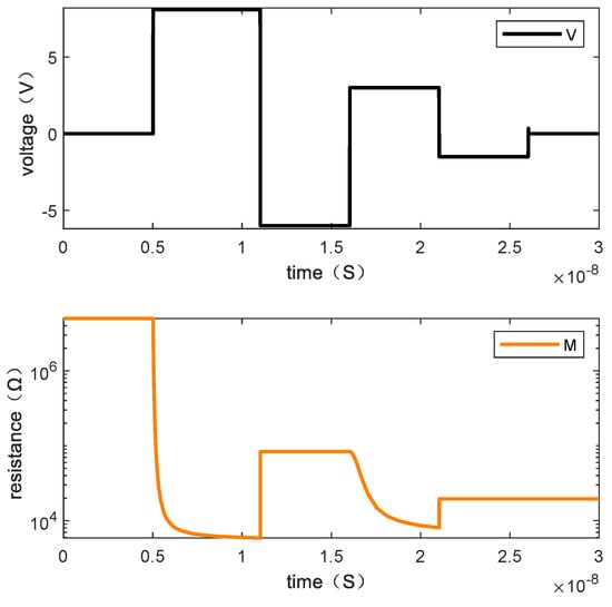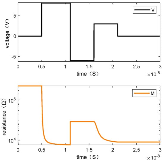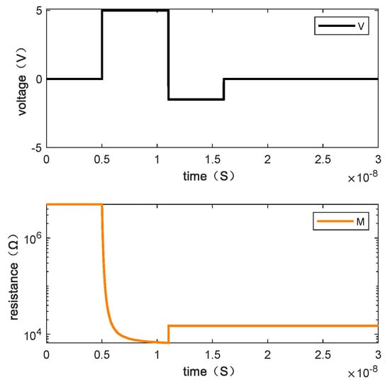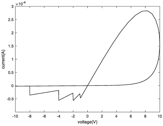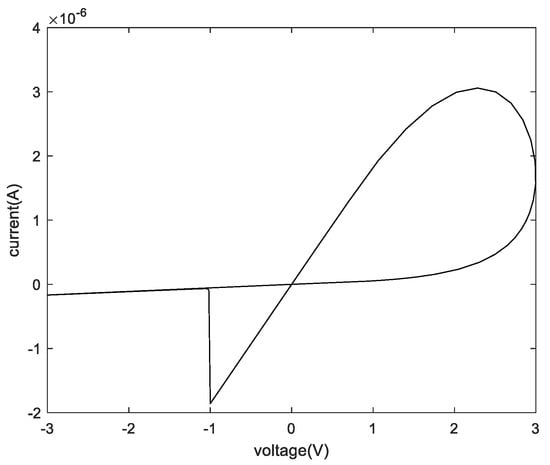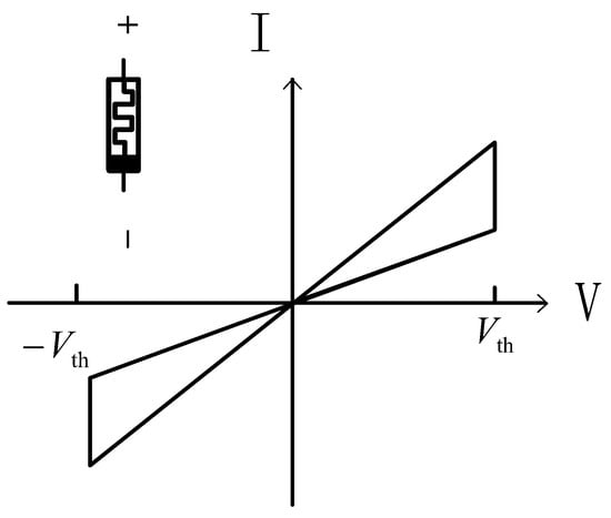 Among them, and represent positive and negative threshold voltages, a and p are curve fitting parameters, and and are linear adjustable parameters. Only when the input applied voltage meets the threshold condition (), the state of the memristor will be changed. The relationship between voltage and current of the memristor can be described in Figure 1.