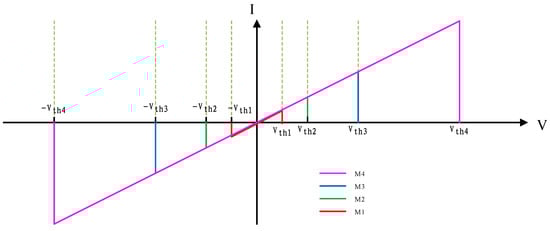 Based on the DSAM model mentioned above, we propose a memristive cluster structure consisting of four memristors, as shown in the dotted line in Figure 2. The four memristors have different threshold voltages and threshold resistances. Assume that the threshold voltages and resistances of the four memristors satisfies