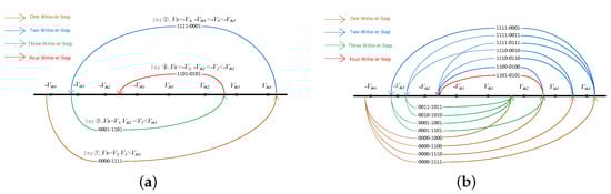 Suppose and represent logic 1 and 0, the logic value of memristor is the lowest bit of the 4-bit binary, the logic value of is the highest. The initial state of all memristors in this paper is . Thus, the logic value of the memory cell is “0000”. To write correct data to the memory cell, we should set appropriate voltage impulses across the memristors to change their states. The operations of writing data to the memory cell are as follows.