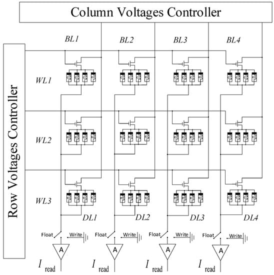 When the proposed memory cells apply to the binary or ternary memory, the crossbar of multi-valued storage is shown in Figure 5. The memory cells in the same row can be written and read parallelly. For example, the memory cells A, B, C, and D can be activated and have the write operation by bit lines (BL1, BL2, BL3, BL4). Then, we give them a read voltage impulse to read the current by the DL1, DL2, DL3, and DL4. DL1, DL2, DL3, and DL4 are usually connected to an amplifier. Thus, we can attain the data of memory cells A, B, C, and D in parallel by DL1, DL2, DL3, and DL4, respectively.