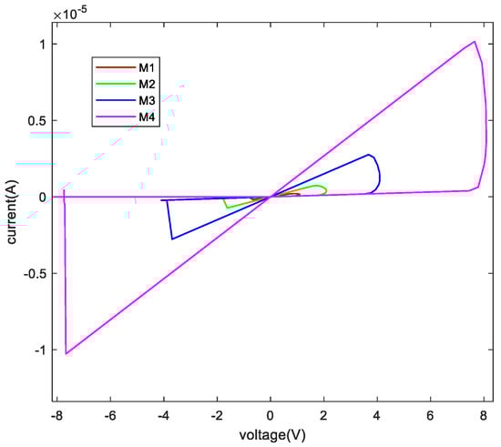 When a sinusoidal voltage is applied to four memristors, the current-voltage characteristic curves of , , , and perform as illustrated in Figure 3, having conspicuous threshold features.