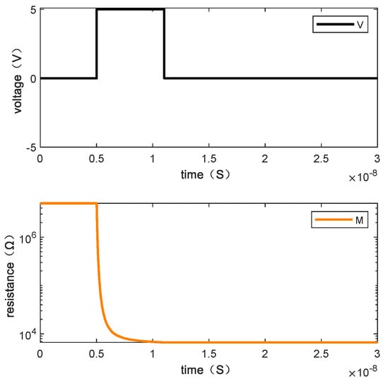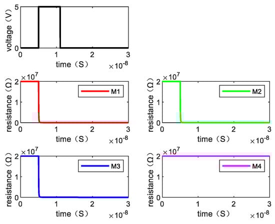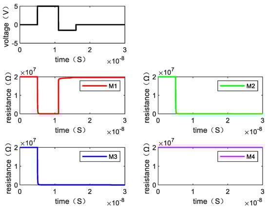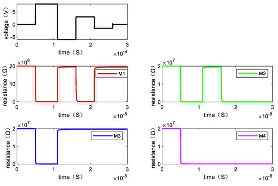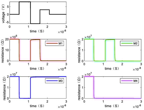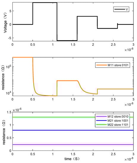 Writing “1101” requires three steps. Figure 13 shows the resistance changes of memristor , , , and when the written data is “1101” by giving the voltage and Figure 14 is the resistance changes of the memory cell.