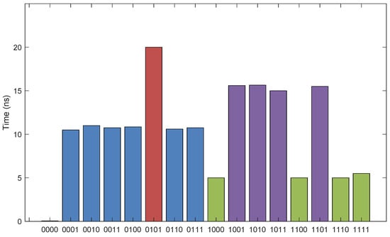 Due to the different steps of writing data, the time of writing operation is also different. The duration of the pulse voltage supplied in each step designed in this paper is 5 ns, and the delay of each step operation is about 0.01 ns. The actual time required for writing data is shown in Figure 17, and the average time for writing a datum is about 10 ns.