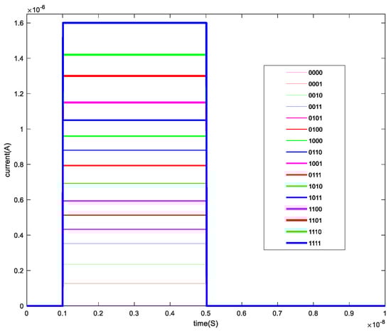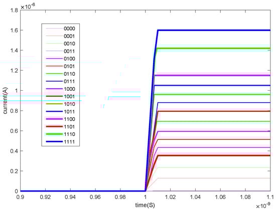 The state of each memristor in the memory cell is changed through the write operation. On this basis, the read operation is to apply an applied voltage to the memory cell and read out the output current after passing through the unit. Figure 18 shows the output current when writing data “0000”, “0001”, “0010”, “0011”, “0100”, “0101”, “0110”, “0111”, “1000”, “1001”, “1010”, “1011”, “1100”, “1101”, “1110”, and “1111”. At this time, the applied voltage is 0.01 V.