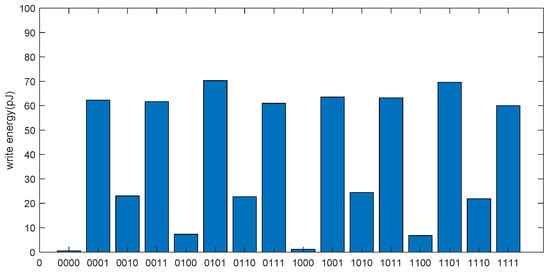 Different logic values are written through the write operation, and the energy consumption of 16 write operations is simulated. The simulation results are shown in Figure 20. Due to the different write steps and write voltages of different logic values, the energy consumption will be affected.