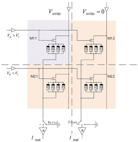 Write logic value “0110”. It requires two steps. Firstly, set write voltage , as the operation 1, the logic value of the memory cell is “1110”. Secondly, set write voltage , which is only higher . So the logic value of converts to 0, but , , and are unchanged. Then the logic value of the memory cell is “0110”.