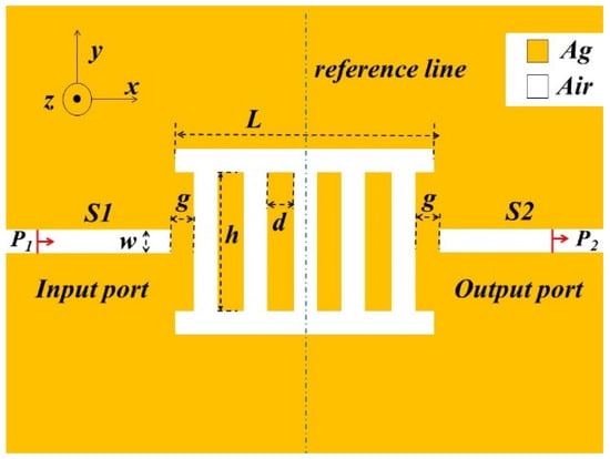 The refractive index sensor structure of a transverse ladder-shaped resonator based on an MIM waveguide is shown in Figure 1. Two MIM waveguides are placed on metallic silver, and a TLSNC is placed between the two waveguides. The yellow area and the white area represent silver and air, respectively. The geometrical analysis model based on FEM was established in order to explore its optical response characteristics. The width w of MIM waveguides, the horizontal strip-shaped cavity and the vertical strip-shaped cavity remain constant at 50 nm in order to ensure that only TM0 can propagate through the waveguide structure []. d is the separation distance between two vertical rectangular cavities. The length of the two rectangular cavities on the side is signified as L. h expresses the height of the five vertical strip-shaped cavities. g is defined as the coupling gap between TLSNC and the two MIM waveguides.