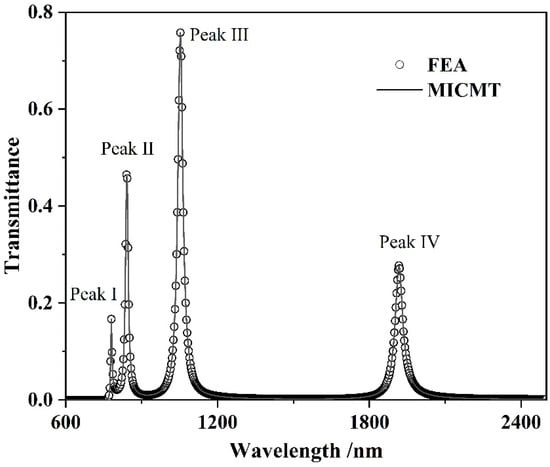 COMSOL Multiphysics software (COMSOL Inc., Stockholm, Sweden) was used to establish the geometric analysis model for the optical response characteristics of the decoupled structure. The magnetic field characteristics of the two-dimensional model do not differ seriously from those of a three-dimensional structure []. Therefore, in order to save memory and reduce complexity, this paper adopts the two-dimensional model for simulation analysis. The FEA was used to analyze the propagation properties. The geometric parameter settings are as follows: L = 510 nm, h = 200 nm, d = 50 nm, w = 50 nm and g = 10 nm. The normalized transmittance of the waveguide configuration is described as the quotient of the energy flow between the output end and the input end. The comparison between the simulation results and theoretical calculation results of MICMT is shown in Figure 2. As shown in Figure 2, the graph confirmed that the simulation results of FEA and the theoretical calculation results of MICMT were a match. At the same time, it can be seen that four high-quality resonance peaks—named Peak I, Peak II, Peak III and Peak IV—appear in the transmission spectrum of the proposed structure. The four resonance peaks enhance the ability of the system to eliminate interference factors.