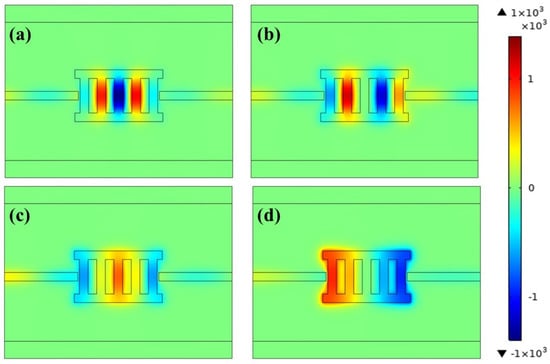 In order to understand the physical reason for the four resonance peaks more comprehensively and deeply, the magnetic field distributions of four transmission peaks at their wavelengths (λ = 780 nm, 843 nm, 1053 nm and 1917 nm) were drawn. All of the magnetic field diagrams are normalized for research convenience. As shown in Figure 3, standing wave resonance occurs in the TLSNC and MIM waveguides of the four modes, such that the incident light can pass through the resonant cavity and exit to form resonant peaks. It was found that, compared with Peak IV, Peak III has weaker magnetic field distribution in the TLSNC and stronger magnetic field distribution on the waveguide, as displayed in Figure 3c,d. As shown in Figure 2, the transmission peak amplitude of Peak IV is less than that of Peak III. This shows that when the energy of the TLSNC is divided more, the energy of the exit waveguide is divided less, resulting in a smaller transmission peak.