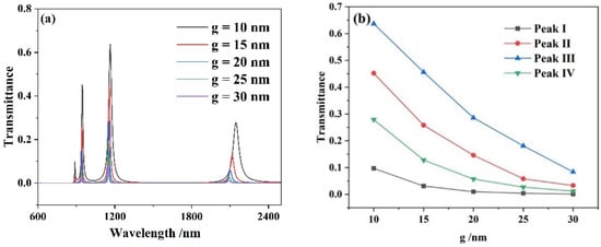 Considering the practicability of the whole system, firstly, the influence of coupling gap g on the system performance is studied by changing the g from 10 to 30 nm at an interval of 5 nm. As represented in Figure 4, with g increased, the blue shift appears in the transmission spectra in a very small range, which is almost negligible, but the transmittance of the transmission peak decreases sharply. This can be explained by the fact that when the coupling gap g between the TLSNC and MIM waveguides S1 and S2 increases, the effective coupling distance of the system decreases, the transmission efficiency of the overall structure decreases, and the transmittance of the system decreases. The coupling gap g determines the bottleneck of the whole system, which can be seen from the influence of the coupling distance on the transmission spectra of the whole system.