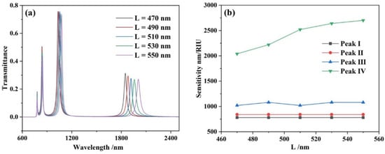 In order to investigate the influences of the diverse lengths of the two rectangular cavities on the side, L was increased from 470 nm to 550 nm in steps of 20 nm. Other arguments were set as h = 200 nm, d = 50 nm, w = 50 nm and g = 10 nm. As shown in Figure 5a, with the increase of L, the transmission spectra of the four resonance peaks show different degrees of red shift. This phenomenon could be explained by analyzing the magnetic field distribution. As shown in Figure 3a, the magnetic field energy of Peak I has a distribution mainly in the perpendicular rectangular cavity, while there is only a very weak magnetic field distribution in the horizontal cavities on both sides. In Figure 3d, Peak IV has a strong magnetic field energy distribution in two horizontal cavities. This leads to the large redshift of Peak IV, while the redshift of Peak I is almost negligible.