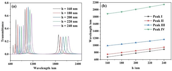 (a) Transmission spectra for different heights h of the five vertical rectangular cavities; (b) varying wavelengths with the increasing lengths of the five vertical rectangular cavities.
