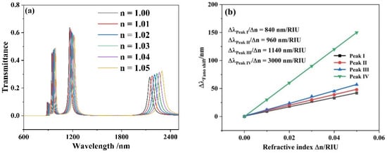(a) Transmission spectra for different refractive index n values; (b) the change of the peak wavelength with the different refractive indexes.