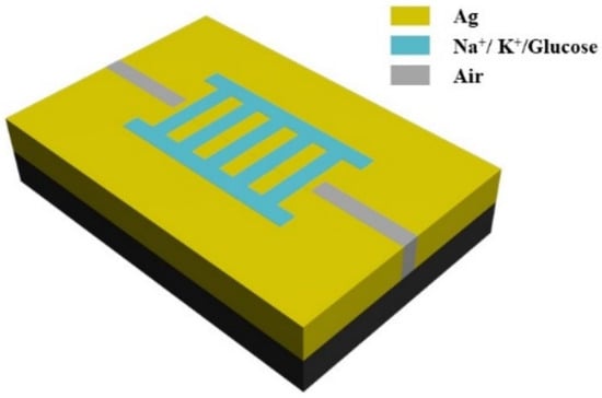 The proposed structure can also serve as a biosensor. There are many patents for biosensors based on surface plasmon resonance [,,]. In human body fluid, sodium ions (Na+) are the most important electrolyte in extracellular fluid, and potassium ions (K+) are the most important electrolyte in intracellular fluid. Na+ and K+ are of great significance in order to maintain the osmotic pressure, body fluid volume and acid-base balance of normal body fluid []. For patients with diabetes, monitoring blood glucose levels is also particularly important. In order to evaluate the detection performance, the TLSNC with the proposed structure was filled with diverse concentrations of Na+, K+ and glucose solution. The schematic diagram of the three-dimensional model is shown as Figure 8. The yellow part, blue part, grey part and black part represent silver, filling solution, air and the substrate, respectively. Silver is used as the designated metal in order to capitalize on its enhanced filed penetration, lower ohmic loss, and lesser bandwidth than other noble metals.