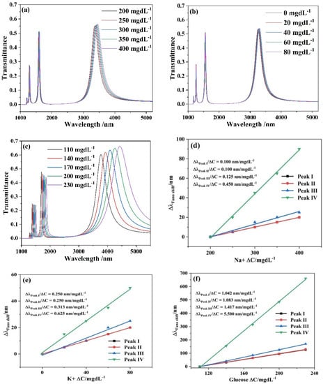 The structural parameters were fixed at L = 550 nm, h = 240 nm, d = 50 nm, w = 50 nm and g = 10 nm. The concentration of Na+ was set to 200, 250, 300, 350 and 400 mgdL−1; the concentration of K+ was set to 0, 20, 40, 60 and 80 mgdL−1. The glucose solution’s concentration was changed from 110 mgdL−1 to 230 mgdL−1, with an interval of 30 mgdL−1. Their transmittance curves are presented in Figure 9. As shown in Figure 9a–c, distinguishable transmission peaks were observed as the concentrations of Na+, K+ and the glucose solution varied with the patient’s range of possibilities. As the concentration of Na+, K+ and the glucose solution changed by 1 mgdL−1, the observed maximum transmission peak displacements were 0.45 nm, 0.625 nm and 5.5 nm, respectively, which are expressed in Figure 9d–f. Such large transmission peak changes can be easily detected by modern spectrometers. The biosensor model has the advantages of simple construction, fast response, high reliability and easy nano-scale integration, providing a high-performance cavity choice for biosensing devices based on surface plasmons. At the same time, it has certain guiding significance to the development of the real-time monitoring field.
