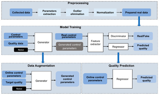- Quality prediction. The online control parameters were collected, preprocessed, and then input to a regressor, which was trained using AR-SAGAN to predict quality.