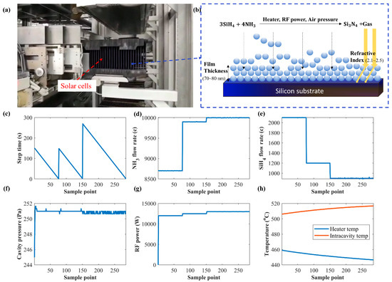 PECVD-based SiNx thin-film deposition process. (a) The real production process. (b) The schematic diagram of PECVD reaction process. (c–h) The data of control parameters collected from sensors.