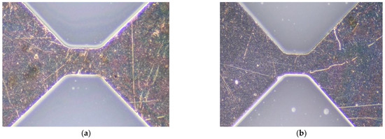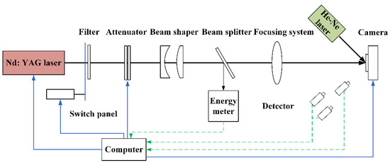 Cu explosive bridge film was deposited with a designed mask on double-sided polished silicon (P-type, 100-grain direction) using a magnetron sputtering machine (MSP-400 B). The target diameter of 60 inches and purity of 99.99%, were fixed on the sidewall of the chamber. The sample table was rotated at 30 rad/min and kept water-cooled. Before the film deposition, all the substrates were placed in a 3:1 mixture of alcohol and diethyl, cleaned for approximately 30 min using an ultrasonic technique, and then, air-dried in a vacuum chamber. The cleaning system used a working vacuum of 2 × 10−1 Pa and an ion beam of 50 mA with an energy of approximately 1500 eV. After 30 min of cleaning, the ion-cleaning source was switched off, and the argon gas supply was stopped for the pulsed arc to deposit the films. A sputtering power of 200 W and an argon gas flow of 30 sccm were used for Cu film deposition. The deposited Cu explosive bridge film with holes and scratches is shown in Figure 1. The laser damage threshold test system was used to damage and repair the film before and after shaping, as shown in Figure 2.