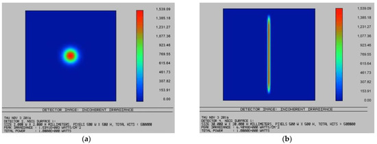 The ZEMAX software was used for the simulation to obtain the flat-top beam. The Powell prism was selected for laser shaping, and the diameter of the flat-topped beam was slightly smaller than that of the Powell prism [14]. In ZEMAX, the entry pupil diameter of the optical system was set as 4 mm, and the type was Gaussian. The initial incident angle equals zero, i.e., both the x and y directions in the field of view were zero. The sector size of the light emitted from the Powell prism was related to the refractive index of the glass and the angle of the prism roof. Meanwhile, the sector size affects the length of the optical stripe at the same projection distance, which is inversely proportional to the angle of the prism surface and proportional to the refractive index of the glass. We used the BK7 glass with a refractive index of 1.5168, which met the requirement of the experiment. Table 1 shows the parameters of the Powell prism after simulation using ZEMAX, and Figure 3a,b show the light power distribution before and after shaping. Thus, we obtained a Powell prism that can shape the Gaussian beam.