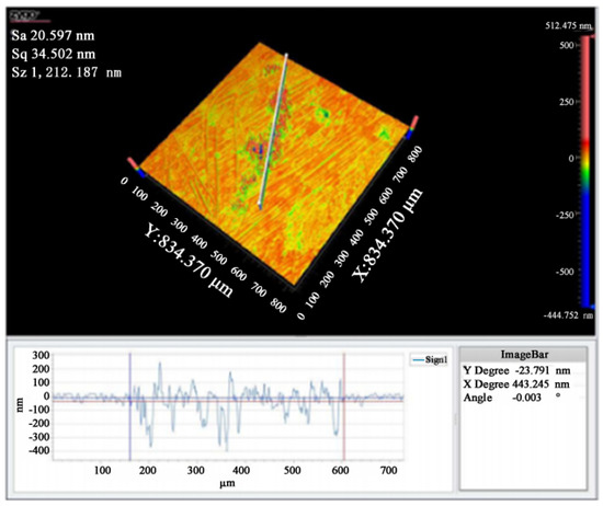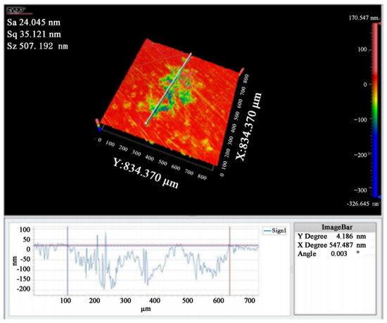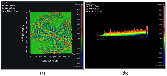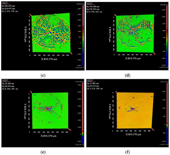 The copper film was fixed on the loading platform of the laser damage threshold system, in which the laser parameters were controlled by a computer to test the threshold value. Different laser energy damages occurred by changing the light transmittance. Then, a profilometer was used to scan the copper-coated silicon damage using a non-shaping laser. Next, optical imaging was conducted using the interference principle to obtain the microstructure after damage. Figure 4a–f showed the micro-topographies of different laser energies at 181, 127, 90, 36, and 18 mJ, respectively. The surface roughness (Sa) was 339.2 nm when the damage energy was 181 mJ. Furthermore, as the energy decreased, Sa also gradually decreased. With the decrease in the laser damage energy comes a decrease in the damaged area and degree, respectively. When the energy is lower, the damage appears in the center more obvious, indicating that the energy is more concentrated. When the energy increased, the peak value of damaged morphology also increased, similar to the energy distribution of the Gaussian laser. Additionally, when the laser energy was 36 mJ, the maximum damage peak difference was about 8.6 um. From the laser repair threshold, molten flow occurs when the laser energy is greater than 41.45 mJ. When it is greater than 97.3 mJ, vaporization and evaporation will occur, which results in the partial repair of the central damaged area. Thus, the damage peak difference is relatively smaller.