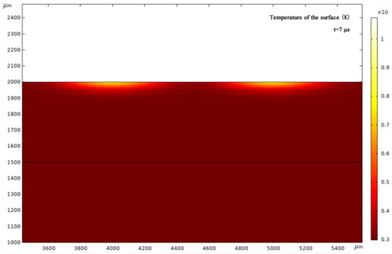 COMSOL software was used to simulate ignition performance using the temperature field distribution. From the finite element method, we obtained the physical phenomena realized by solving partial differential equations of the multi-physics field. The finite difference element method was used to solve current and thermodynamic problems. The meshing of the model structure for copper plated on silicon is shown in Figure 7. Here, the thickness of the film is 2000 μm and the substrate is 2500 μm. Table 2 shows the laser and material parameters.