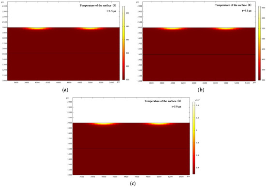 Figure 8 and Figure 9a–c show the simulation results. Observe that the damage depths of the non-shaping and shaping lasers were about 100 μm and 50 μm, respectively. That is, the ratio of the two damages equals 2:1, which is consistent with our experimental test results. Moreover, the surface of the non-shaping laser damage is convex, whereas that of the shaping laser damage is flat. This suggests that different laser shapes can be used to adjust and control the desired damage. When the same laser energy (60 W) was used, the damaged area of the shaping laser was smaller than that of the non-shaping laser. The damaged areas for 6 and 20 W conditions are very similar. Meanwhile, when the damage is maximum by different lasers, the time required and the temperature reached are different, i.e., the non-shaping laser reached 850 K for 7 μs, and the shaping laser reached 1100 K for 5 μs. Additionally, for the shaping laser, different energies can achieve different ignition temperatures, such as 378 K at 6 W, 555 K at 20 W, and 1100 K at 60 W, with the required time being 4.5, 4.1, and 5 μs, respectively. Therefore, the larger the laser energy, the higher the ignition temperature and the longer the ignition time. Therefore, the ignition performance of the bridge film using the repaired shaping laser outperforms that of the repaired non-shaping laser.