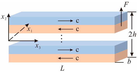 As shown in Figure 1, a multilayered ZnO beam is considered with alternating opposite polarization directions along the thickness direction. It should be noted that this multilayered beam can be prepared by MOCVD [34]. The left end of the cantilever is fixed, and the right end is under the action of a transverse shear force F. The positive direction of the c-axis of ZnO is defined along the positive direction. The length and thickness of the beam are denoted as and , respectively. In the following, means the number of layers. We choose the geometrical middle plane of the beam as the coordinate plane. , , and represent the width, thickness, and axial directions, respectively.