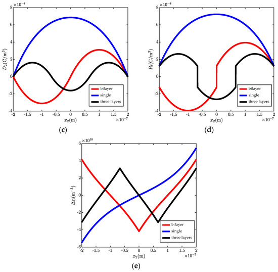 Figure 2 shows the fluctuations of electric potential , electric field , electric displacement , polarization , and carrier concentrations in the different numbers of layers. It is noted that the point without fluctuation of carrier concentrations is set as a reference point to determine the electric potential. It is observed from Figure 2a that there is no potential barrier or potential well appearing in a single layer ZnO beam. However, a potential well appears in the bi-layer case and a potential barrier accompanying a potential well is showed in a three-layer case. Thus, it is easy to conclude that the potential barrier and potential well will alternate with the increasing number of layers. In addition, it is obvious that the barrier peaks and the well troughs appear just at the interface. This is because of the discontinuous electric polarization there, such that polarized charges () are generated at the interface. As shown in Figure 2d, negative polarized charges are generated in a bi-layer beam, which can be calculated from . The same is true for the three-layer beam; positive polarized charges are generated between the first and second layers, and negative ones appear between the second and third layers. Thus, decreases near the negative polarized charges and increases near the positive ones. Correspondingly, the electric potential energy of electrons is increased due to the negative polarized charges, which decrease the concentration of carriers (shown in Figure 2e). In contrast, the carrier concentrations are increased with the decreasing electric potential energy of electrons. As reported in Ref. [46], the local stress distribution induces a similar potential barrier and potential well structure, which would forbid the passing of low-energy mobile charges. Therefore, it is found that the maximum fluctuation of carrier concentration decreases with the increasing number of layers. Moreover, typical characteristics in the hetero-structure are shown in the homo-structure with reversed c-axial, such as the discontinuity electric field shown in Figure 2b. This phenomenon is similar to the multilayered graphene structure, which could present typical characteristics of the hetero-structures due to the interlaminar Van der Waals forces. However, the interface polarized charges are shown in this paper. From Figure 2b, it is also observed that E2 is enhanced because the interface polarized charges weaken the shielding effect of carriers. This is consistent with some experimental studies which found that hetero-structures may reduce the phenomenon of electric leakage [47]. In this study, the configuration of a multilayered beam with opposite c-axis directions can be seen as a special hetero-structure. Therefore, the present study provides guidance to developing new piezotronic devices such as nanogenerators, heterojunctions, transistors, etc. Finally, as shown in Figure 2c, it is further observed that D2 vanishes at the interface, such that the charge neutrality condition is satisfied in each layer.