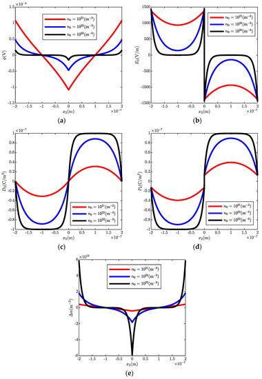 Figure 3 shows the electrostatics in a cantilever ZnO bi-layer with different doping concentrations. The carriers are driven to the upper (lower) surface of the first (second) layer due to the effect of the transverse electric field. It is observed that a platform appears at the region (−1.5, −0.5) and (0.5, 1.5) with the increase of initial carrier concentrations. This is because the shielding effect of carriers is enhanced by the increasing doping concentrations, such that the polarized electric field is screened. It is noted that this region is determined by the Debye-Hückel length. However, the Debye-Hückel length is inversely proportional to doping concentrations [43]. Thus, the effective fluctuation region is shortened with increased doping concentrations. In addition, it is obvious that the doping concentrations have a minute effect on the magnitude of the polarized charges at the interface.