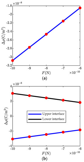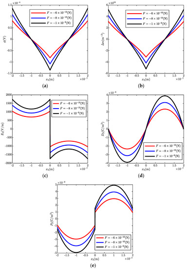 Figure 4 shows , , , , and in a ZnO bi-layer with different transverse shear forces. As expected, the magnitudes of all the electrostatics become stronger with the increasing transverse shear forces. Thus, the potential barrier height and the well depth are strengthened with increasing end forces, such that more energy is needed for the passing electrons. This characteristic can be used to design new piezotronic devices. In addition, it differs from Figure 3d because the magnitude of the transverse shear force has an obvious effect on the polarized charges. The amount of the polarized charges vs. the magnitude of the applied end force is shown in Figure 5. It is observed that the amount of the polarized charges is linearly related to the end force.
