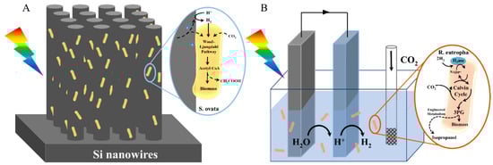 - Sakimoto, K.K.; Kornienko, N.; Yang, P. Cyborgian material design for solar fuel production: The emerging photosynthetic biohybrid systems. Acc. Chem. Res. 2017, 50, 476–481. [Google Scholar] [CrossRef]