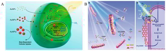 - Zhang, H.; Liu, H.; Tian, Z.; Lu, D.; Yu, Y.; Cestellos-Blanco, S.; Sakimoto, K.K.; Yang, P. Bacteria photosensitized by intracellular gold nanoclusters for solar fuel production. Nat. Nanotechnol. 2018, 13, 900–905. [Google Scholar] [CrossRef]