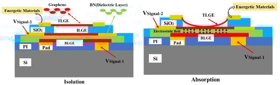 The bottom graphene electrode induces Vsignal-1, an electric field that can be generated between the bottom layer graphene electrode (BLGE) and the boron nitride dielectric layer. The top layer graphene electrode (TLGE) induces an electrostatic van der Waals force to overcome the elastic recovery force and makes contact with the intermediate layer graphene electrode (ILGE). At this time, the energetic materials are connected in series with the peripheral electrical system. When the ILGE induces Vsignal-2, the SCB then produces a high-temperature plasma that is used to drive the copper azide. Finally, the copper azide releases the detonation wave, which is then transferred to the ISCs, allowing for the Psd to be achieved. In addition, when Vsignal-1 is reset, the electric field in the dielectric layer then vanishes. The TLGE resets under the action of the elastic recovery force alone, thus causing the energetic materials to be isolated physically from the peripheral electrical system. Due to the appropriate functional matching design between the actuator and the energetic materials, the energetic materials are suitable for use within the information insurance field.