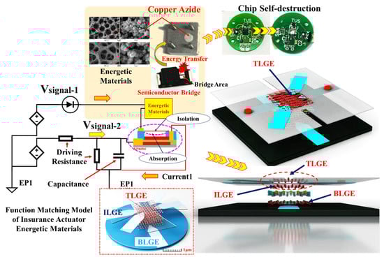 Physical self-destruction (Psd) represents an important method to improve the information insurance performance of information storage chips (ISCs) [1,2]. The German Federal Ministry of Education and Research invested more than €25 million in the ZEUS Trusted Electronics Program in 2020, which is dedicated to developing the information insurance for information storage chips [3]. Under the support of this project, the Psd module with a multi-sensor stack was developed by Fraunhofer Institute. To date, numerous research institutions have announced a variety of schemes (e.g., using high-voltage excitation, electrochemical degradation, detonation stress waves, and other methods) to achieve the Psd of ISCs. For example, the US Defense Advanced Research Projects Agency (DARPA) launched the Vanishing Programmable Resources (VAPR) project in 2013 [4]. According to the self-destruction requirements for military-grade electronic equipment that were developed by the US military, the VAPR project [5] was based on a “pressure release trigger decomposition” approach, which was intended to verify that military electronic systems had the ability to be destroyed in a physical manner; this would prevent the leakage of secret information and manufacturing processes after reverse engineering of the core electronic devices. In 2015, the Xerox Palo Alto Research Center released a self-destructing chip [6]. The mechanism was triggered by a laser or wireless signal, causing the chip to heat up and crack the electronic device by heat accumulation. After the thermal shock occurred, the substrate broke within a few seconds, and the device could then not be restored. However, these methods relied on the application of external high-power energy, e.g., laser signals, and thus, apply to a limited number of scenarios. Therefore, energetic materials [7,8] have been used to generate detonation waves (GPa level) in microseconds via voltage excitation (below 5 V) to achieve Psd. However, because of the low driving thresholds of these energetic materials, the improvement of the anti-interference capabilities of these materials has become another core issue in this field. Many anti-interference ability protection measures use a transient voltage suppression (TVS) diode [9,10,11,12] to absorb transient energy. The voltage clamp was applied between two poles and was set at a predetermined value that could not be adjusted for use under different environments [13,14,15,16], but its energy absorption performance was limited [17,18]. In 2020, the Beijing Institute of Technology announced OFF-ON-OFF microelectromechanical systems based on a modified Paschen’s law [19]; in this system, a comb-shaped actuator (electrode gap: 1–10 µm) was able to reduce the threshold voltage to 130 V for air breakdown [19], and the electrical state was switched in an OFF-ON-OFF sequence to complete energy grooming for abnormal interference signals. In addition, a metal-based “OFF-ON” actuator was designed based on corona discharge theory to achieve air breakdown at a threshold voltage [20,21,22,23]. These schemes can be used to provide an energy grooming function to achieve insurance control of the energetic materials. However, the threshold voltage generally still exceeds 45 V [24,25], which represents a comparatively high energy burden for Psd modules. In contrast, only the “ON-OFF” actuator offers the advantage of low voltage operation. In 2010, Rossi from LAAS in France developed three actuators: an electrothermal evaporation-breaking solid actuator, an electro-explosion-breaking solid actuator, and an electrothermal welding-conducting solid actuator. These three actuator types mainly rely on the thermal accumulation of their metal electrodes. This thermal energy acts on the sensitive mechanism of the actuator [26,27], causing electrode melting/vaporization and other phenomena. The voltage pulses for these actuators are distributed over a range from 3.3 V to 8 V, and the response times of the actuator states (i.e., ON-OFF) are on the microsecond scale. In 2014, Beijing Institute of Technology presented a solid-state actuator based on a multilayer metal stack. This type of actuator can melt out completely under a threshold voltage of 1.5 V. The response time distribution for the actuator ranges from 10 ms to 150 ms [28,29]. These actuators can only isolate the energetic materials from the peripheral electrical system by parallel connections, but the isolation method is only intended to provide electrical isolation, and thus, cannot shield the materials from the effects of the leakage currents. Therefore, based on the insurance requirements for energetic materials discussed above, this paper presents an insurance actuator that provides physical isolation from peripheral electrical systems through functional integration with the energetic materials, which also reduces triggering of the materials by leakage currents. The proposed technique has a strong practical application value.