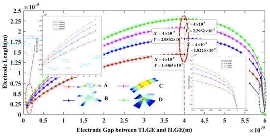 To increase the TLGE motion displacement, this paper proposes four electrode models in combination with the mechanical relation given in Equation (1). The relationship between the electrode length and the motion displacement was obtained as shown in Figure 3, and a mechanical simulation analysis of the TLGE was performed as shown in Figure 4.