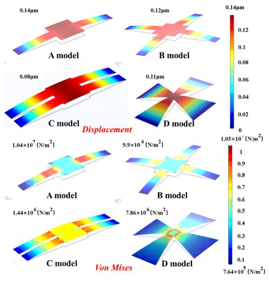 When the TLGE induced the electrostatic Van der Waals force for 1 µs, the A model produces the maximum von mises and motion displacement (10.4 MPa, 0.14 μm), the C model produces the minimum von mises and motion displacement (1.44 MPa, 0.08 μm), in which the maximum von mises is less than the graphene fracture strength, and the minimum displacement is greater than 4 nm. It can be seen that the four TLGE models of the insurance actuator can satisfy the transformation from the “absorption” to “isolation” states under steady-state conditions. The relationships among the “absorption” time, the electrode model, and the displacement are analyzed, with the results illustrated in Figure 5.