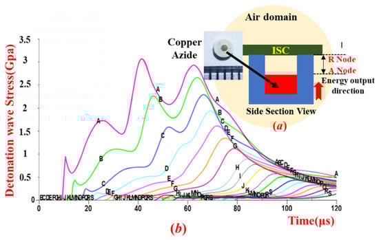 According to the results in Figure 6b, the air gap between the copper azide in the energetic material and the ISC can be divided into 17 nodes (A–R nodes), where the gap between adjacent nodes is 0.05 mm. The stress versus time relationship can be obtained from the LS-DYNA analysis: the stress at each node in the air domain increases initially and then decreases, and the stress wave attenuates rapidly beyond the backward position of the node.