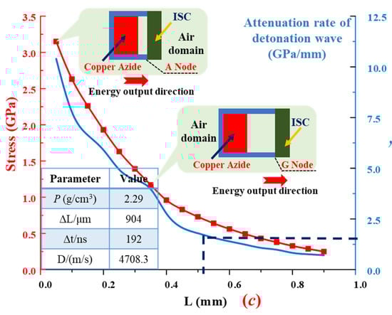Figure 6c shows the stress attenuation relationship of the detonation wave at each node in the air domain. When the node is located within the A–G range, the attenuation rate of the detonation wave reaches 4.2–10.4 GPa/mm. When the node is located within the H–R range, the stress wave attenuation rate then reaches 0.7–2.6 GPa/m. In other words, because of the serious attenuation of the stress during the initial stage (from the A node), the stress value at the H–R node is not sufficient to achieve ISC Psd. Therefore, the assembly gap between the copper azide and the ISC must be in the 0.05–0.25 mm range.