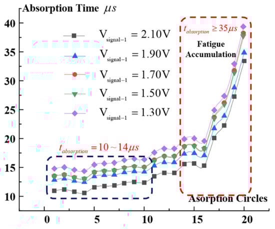 Over the same number of test cycles (cycles = 1–14), the driving voltage (Vsignal-1) of the BLGE gradient ranges from 1.30 V to 2.10 V, and the absorption time of the TLGE decreases, with a distribution within the 10–14 µs range. Under the same driving voltage, the absorption time increases with increasing numbers of cycles. When the number of cycles reaches 20, the absorption time then exceeds 35 µs.